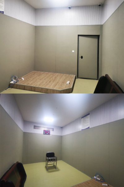 羈押室必須全部使用防火防撞棉、防火皮革面料等羈押室軟包材質(zhì),室內(nèi)無凸出陽角和明柱,采用防爆燈具照明,配齊手銬、腳鐐固定環(huán),防止發(fā)生被羈押人員撞擊、自殘、脫逃等意外人身傷害情況。