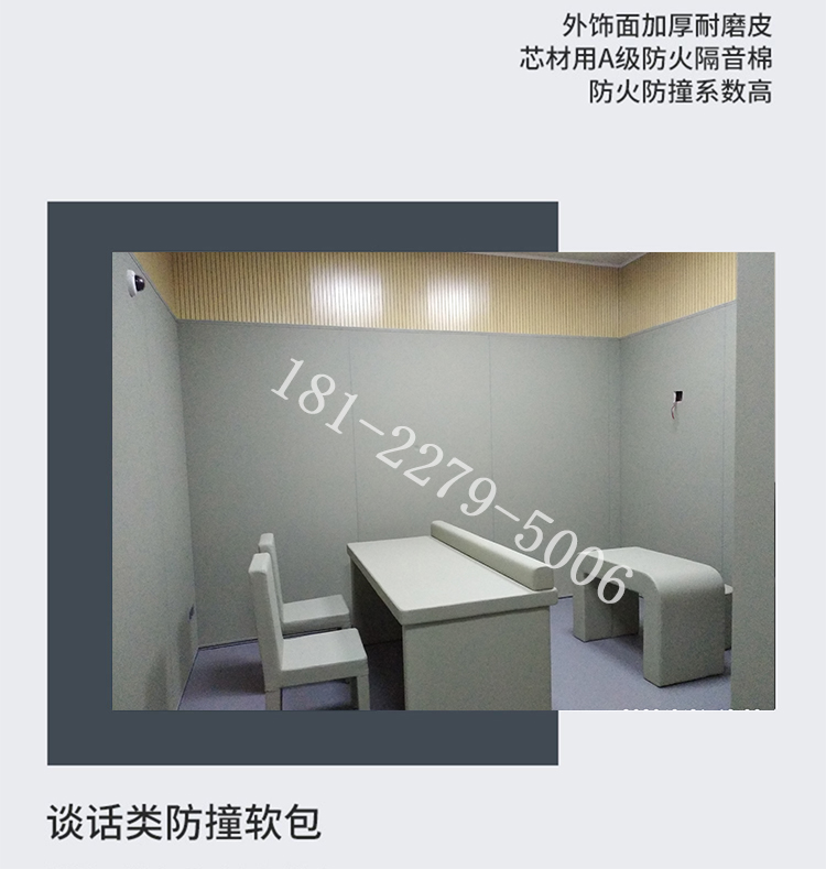 審訊室防撞軟包,是一種獨(dú)特的阻燃防撞材料,兼具阻燃、環(huán)保、防水、防撞四大特點(diǎn),目前還廣泛應(yīng)用在紀(jì)檢委、派出所、看守所、監(jiān)獄、拘留所、談話室、留置室、詢問(wèn)室、辨認(rèn)室、辦案區(qū)、衛(wèi)生間等機(jī)關(guān)場(chǎng)所。具有阻燃、環(huán)保、防水、防撞+吸音板安裝可以達(dá)到吸音效果。